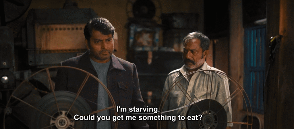 This is shown in a subtle way. While the Navy officer is showing the movie to Pappachan, we can hear a background voice-over from the film where a boy asks someone for food, and the other person offers him food.